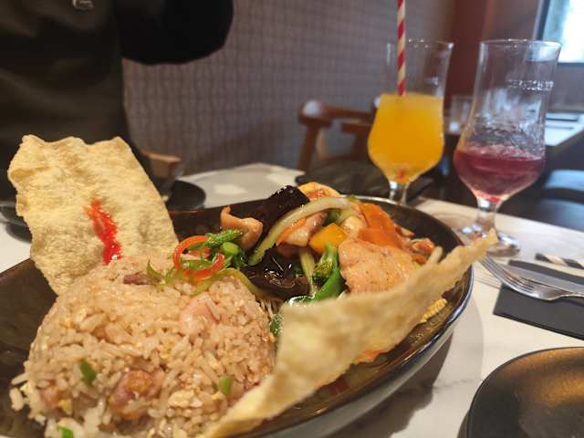 - Arroz frito, pollo, cerdo, langostino y pato