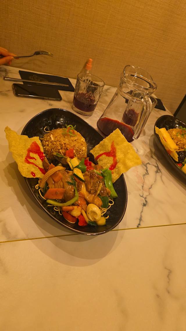 - Arroz frito, pollo, cerdo, langostino, pato, fideo frito, tortilla de huevo.