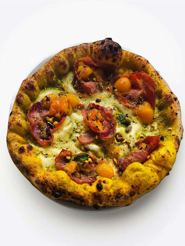 - Pizza fritta con impasto curcuma condita con pomodorino giallo, stracciatella di bufala, acciughe del mar cantabrico, zeste di limone, crumble di tarallo napoletano.