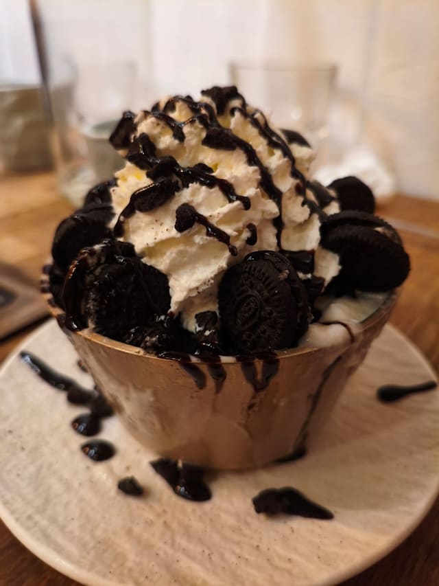 Dessert coréen à base de glace finement pilée comme des flocons de neige agrémentée de matcha, d’oreo ou de haricot rouge (au choix)