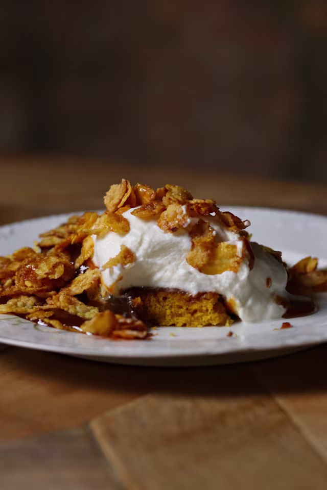 - Cake maïs et coco, glace mangue, dolce de lait, corn flakes