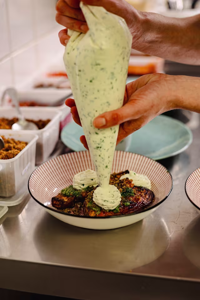 - Aubergine en croûte de maïs, sauce miso, vierge de concombre, pickles