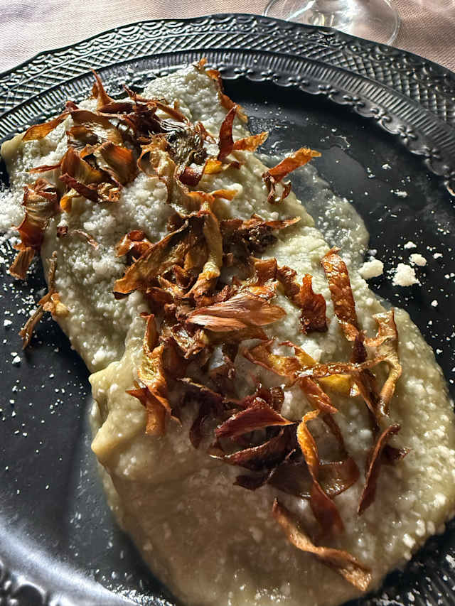 - Raviolo verde ripieno di ricotta e carciofi con salsa di pecorino e carciofi fritti.