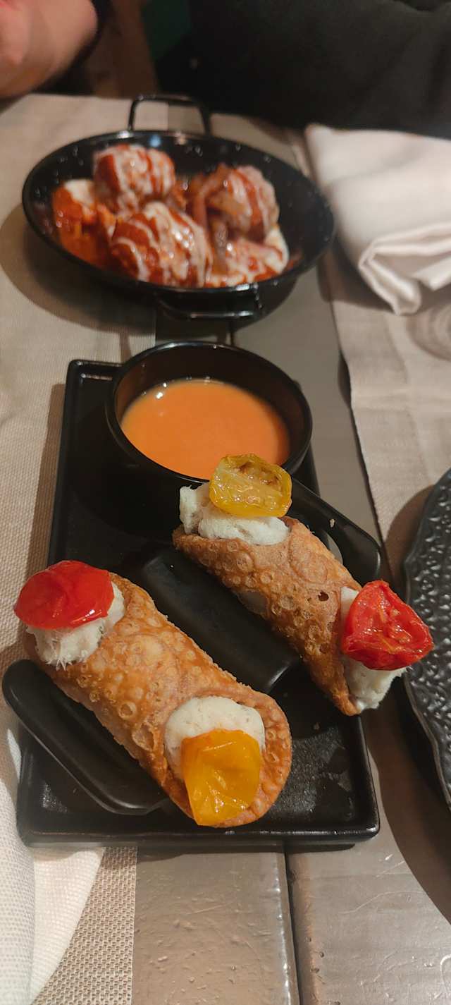 - Tortino di melanzane ripieno di ricotta al basilico, salsa al pomodoro San Marzano, crema di basilico e fonduta di pecorino romano DOP.