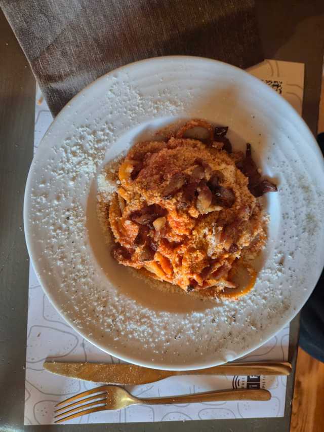 - Rigatoni, guanciale di Amatrice, pomodori San Marzano, pecorino romano DOP.