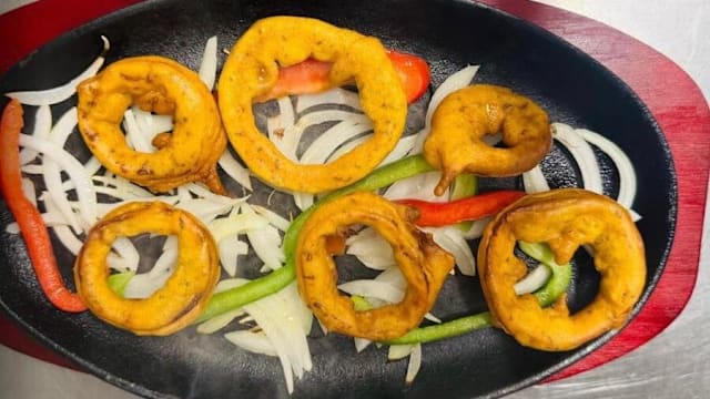 Mélange de 3 beignets à la farine de pois, chiche, oignons, p.t., aubergine. Accompagné de main maison nun nature ou non fromage