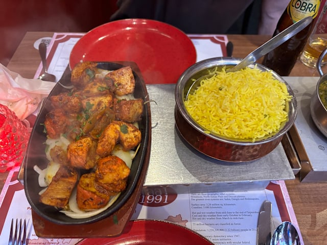 Thank you for your fantastic review! We’re so glad to hear that you all enjoyed your meals, especially the chicken curry, tikka, samosas, and garlic chicken. It’s wonderful to know our friendly staff and quick service made your experience even better. We’re also happy you liked the facts about India on our placemats—it's a fun way to learn while dining! We appreciate your feedback and can’t wait to welcome you back for another delicious meal. See you soon!