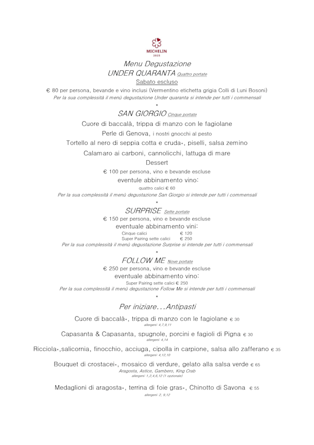 9.5/10Nice venue, friendly service, high quality food although some courses were not of our taste. The "San Giorgio" menu was balanced and the best dish was the "perle di Genova"