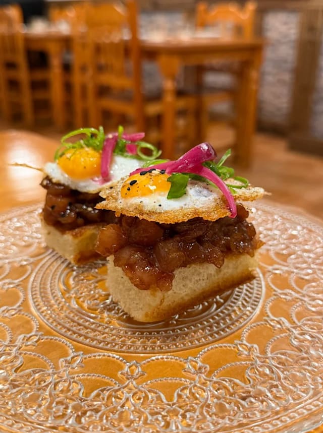 - Tartar de atún con aceite de trufa blanca, huevo de codorniz sobre un brioche.