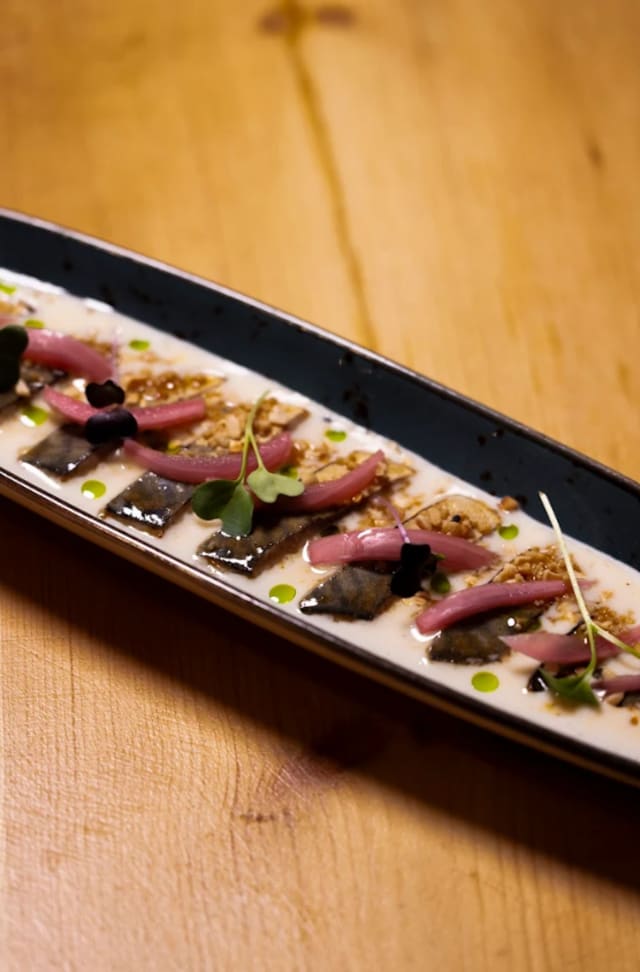- Con aceite de albahaca, burrata, caballa soasada con soja y vinagre de arroz.