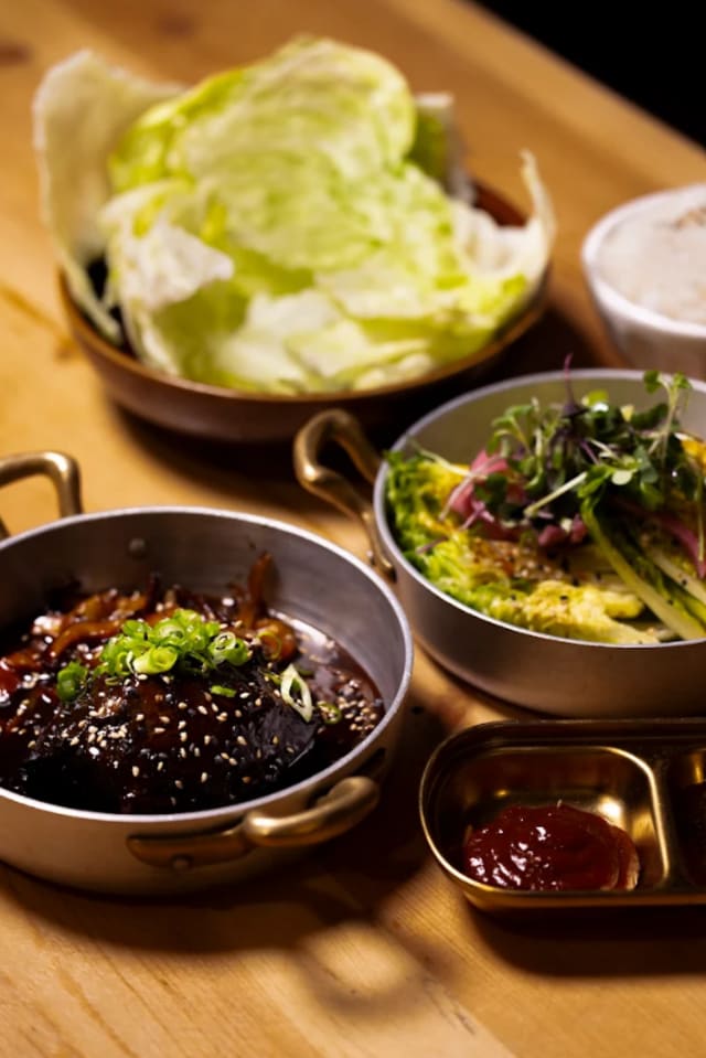 - Panceta de cerdo a baja temperatura con calçots, lechuga y ssämjang