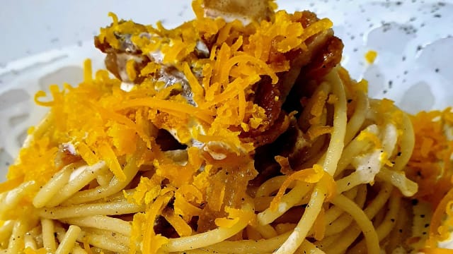 Spaghetto burrata pancetta uovo marinato