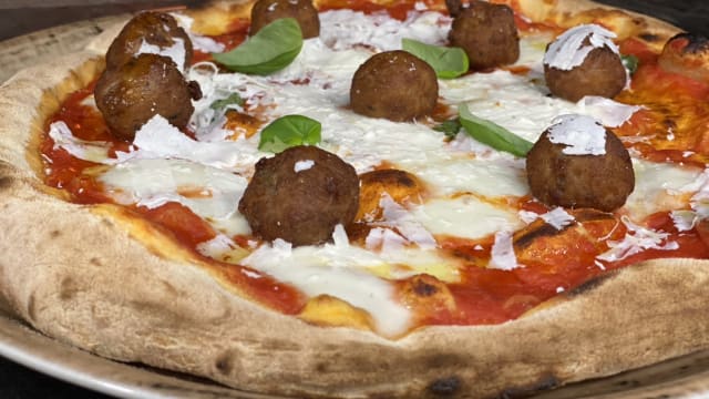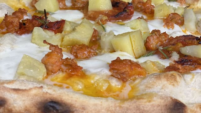 In cottura: mozzarella, salsiccia piccante; fuori cottura: pistacchio, crocchette, basilico