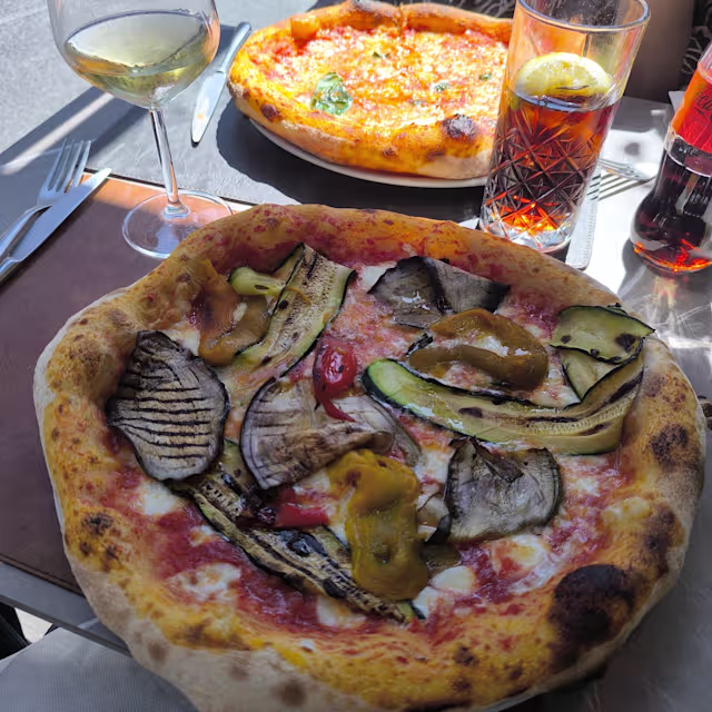 - Pomodoro, fiordilatte, zucchine, peperoni, melanzane, crema di basilico, olio EVO