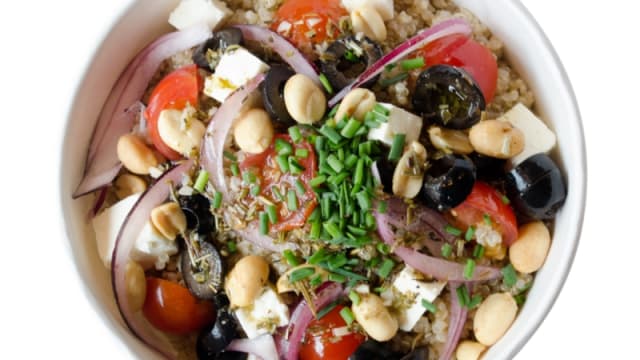 base de espinaca y quinoa, salsa de yogurt vegano, cebolla morada, aceitunas negras,