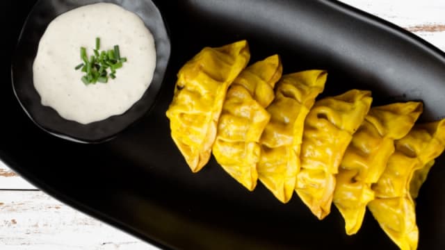 Gyozas de pollo al curry deliciosas Gyozas de pollo al curry con vinagreta blanca ligera. ¡una explosión de sabores!