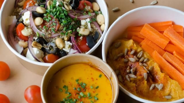 Quinoa, espinaca, salsa de yogurt vegano, tomate cherry, aceitunas negras, pepino, cebolla morada, falafel con perejil, y cebollino.