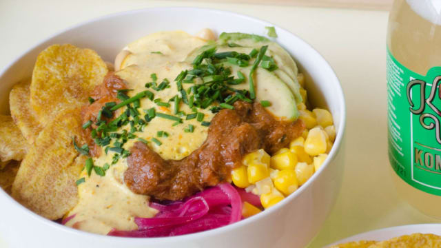 Arroz verde, salsa de ají amarillo, chips de plátano, maíz, cebolla encurtida, cacahuetes, carne pullpork BBQ, aguacate y cebollino.