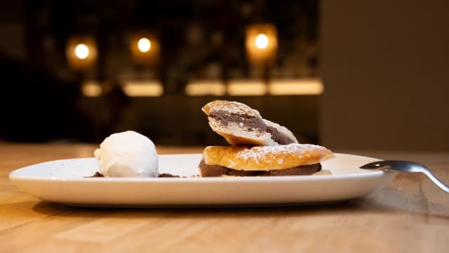 Berlina asada, nutella de pistacho. Polvo de lotus y helado de chocolate amargo