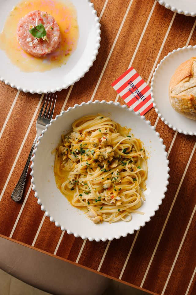 - Pasta fresca con vongole, gamberi*, calamari*, cozze, pomodorini e peperoncino