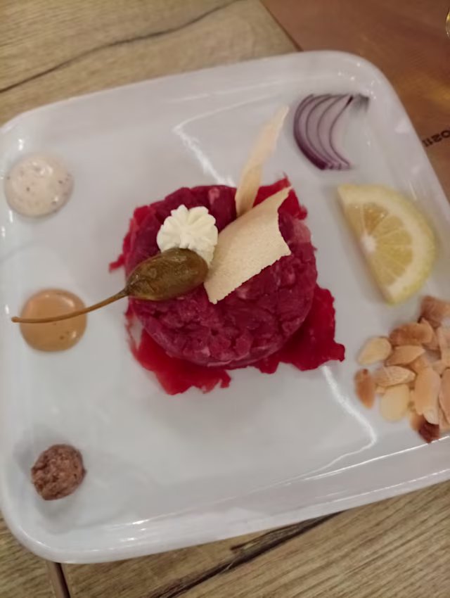 - Tartar di fassona piemontese condita con olio evo e polvere di rosmarino. Accompagnata con: pesto di olive taggiasche, senape al miele, maionese al tartufo, cipolla di tropea, scaglie di mandorle, robiola, capperi e pane curasao