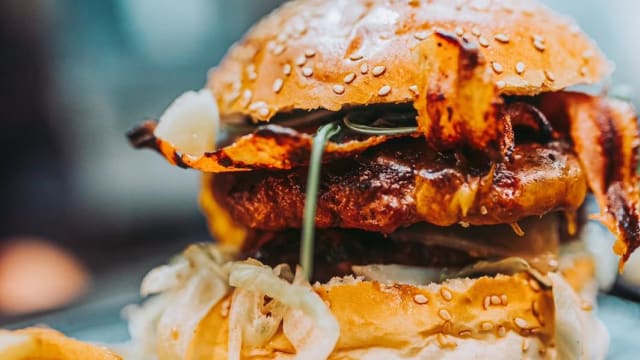 Hamburger di angus 220 gr, scamorza affumicata, anelli di cipolla, salsa teriyaki