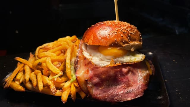 Hamburge di angus 220 gr x 2, cheddar svizzero, lattuga, bacon croccante, scaglie di grana, rucola e salsa a scelta