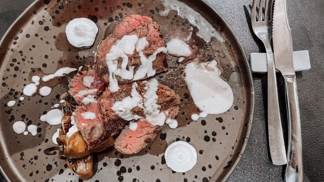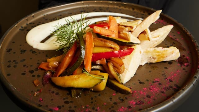 Mozzarella, datterino giallo, alici del cantabrico, tartare di tonno, e cipolla caramellata