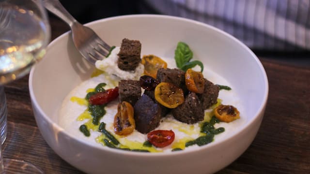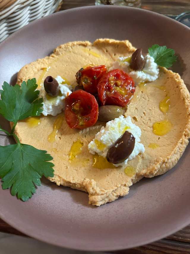 Hummus di ceci, olive taggiasche, pomodorini e ricotta di