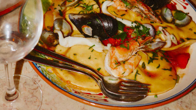 Risotto carnaroli, caldo de mar, camarão, mexilhão, amêijoa