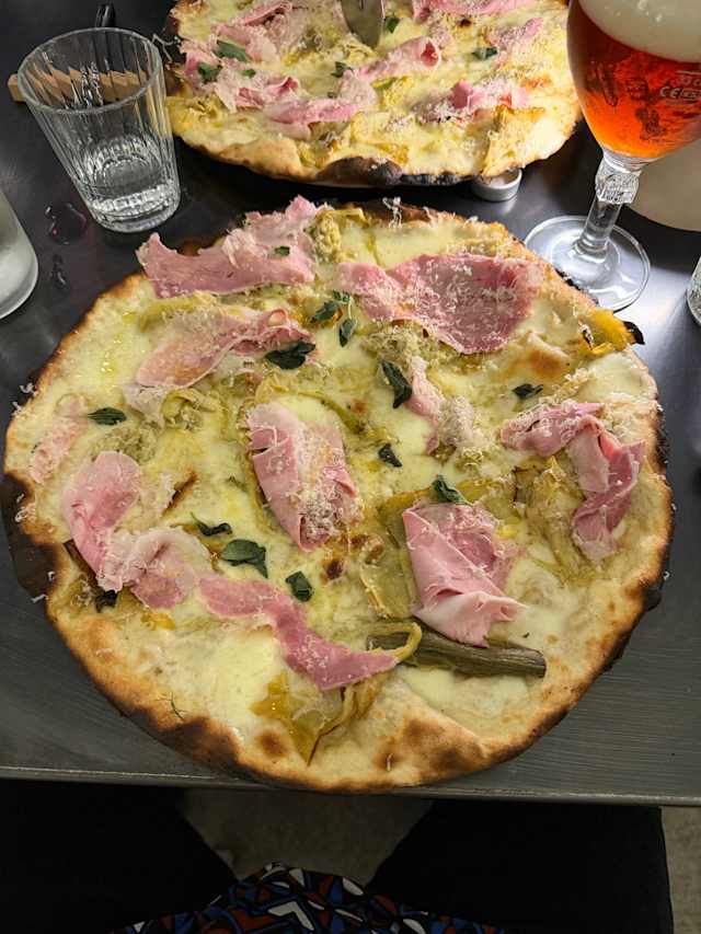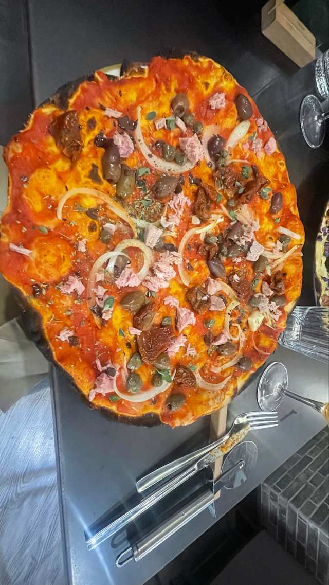 - San marzano, prosciutto crudo, fiordilatte, carciofini, funghi shiitake, tuorlo d’uovo e olive nere