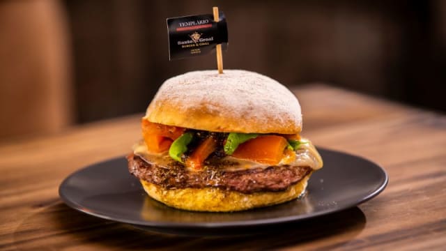 Pão tradicional s/sementes de sésamo, molho santo graal, hambúrguer de vaca, queijo provolone, chimichurri, confit de tomate com ervas aromáticas e rúcula.