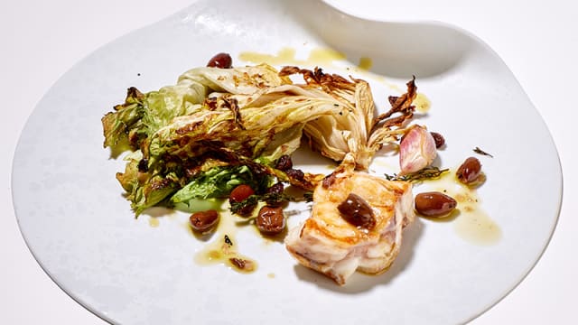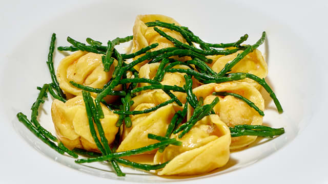 Tortello di mazzancolle e verdure, salsa di vongole e asparagi di mare