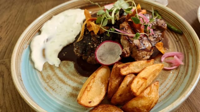 Nöttfärsbiff toppad med riven fetaost serveras med friterad klyftpotatis, frästa grönsaker, tomatsås, auberginepuré och tzatziki / Ground beef topped with grated feta cheese served with deep-fried potato wedges, fried vegetables, tomato sauce, eggplant puree and tzatziki