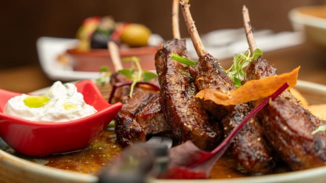 Grillade lammracks serveras med friterad klyftpotatis, frästa grönsaker, tzatziki, rödvinsås och vitlökssmör / Grilled racks of lamb served with deep-fried potato wedges, fried vegetables, tzatziki, red wine sauce and garlic butter