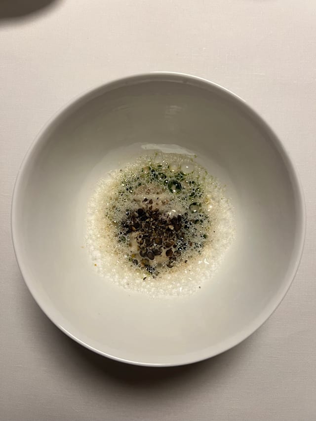 Il suo brodo ristretto al carricante, fagiolino marinato, miele e finocchietto selvatico