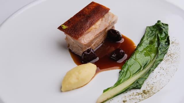 Cotta a lungo, il suo sugo all’ aceto e amarena in conserva, melanzana arrosto. Il ricordo dello sciroppo ghiacciato di amarene in acqua frizzante ad accompagnare il piatto