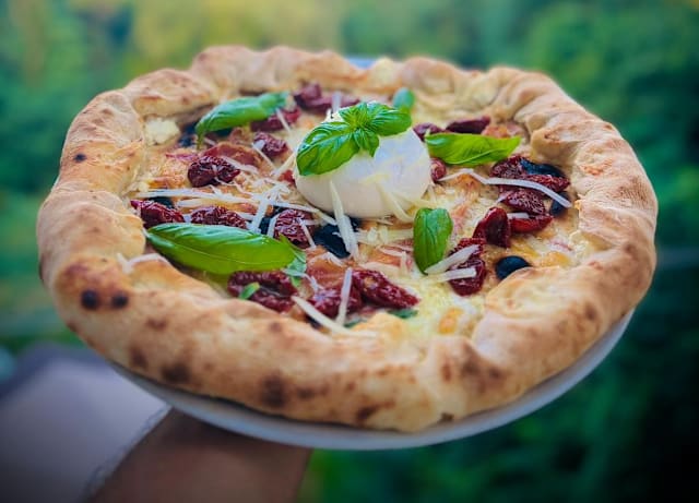(Cornicione ripieno di ricotta, mozzarella, pomodori secchi, burrata e pancetta croccante)