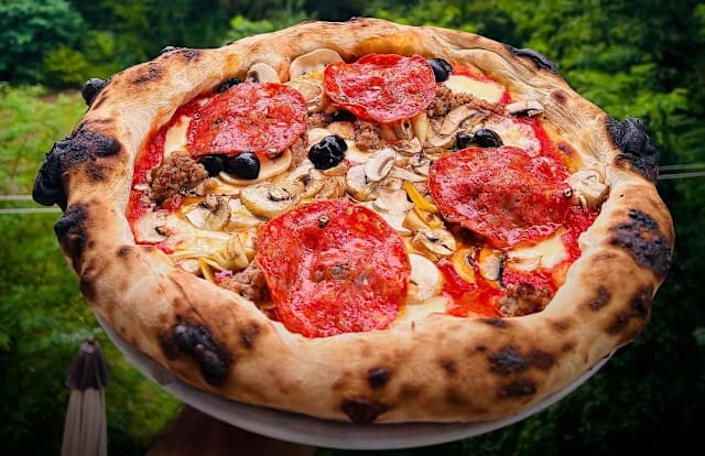 (Pomodoro, mozzarella, olive nere, carciofi, funghi e cotto)