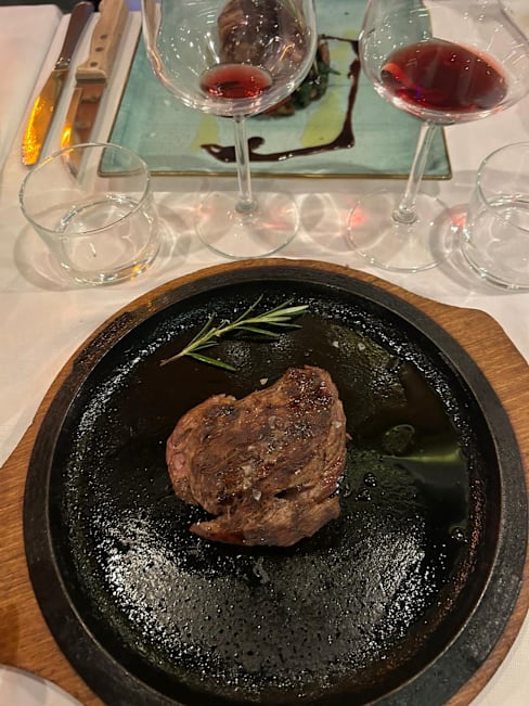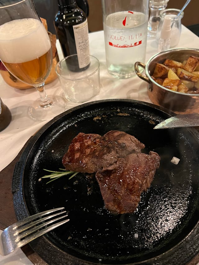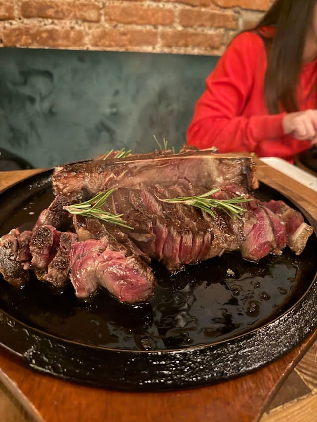 9.5/10Steak was top notch. We took a 1.3kg costata of "Old Cow" from the Alps, dry Aged 50 days. The meat was fragrant, with appetizing mailllard crust outside and a perfect texture on the inside (not too tender nor too tough - just right). The starters were very good as well, with prime grade black truffle. Service was professional and courteous. The steakhouse itself has a small, but intimate ambience. Overall I definitely recommend