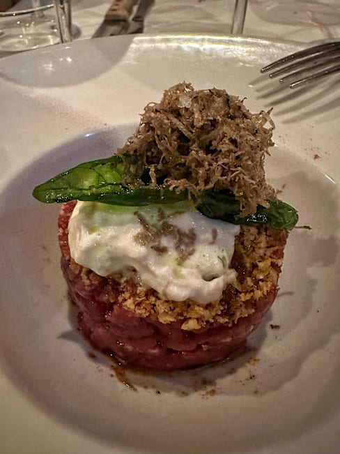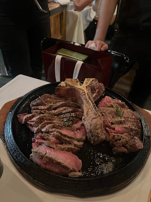 9.5/10Steak was top notch. We took a 1.3kg costata of "Old Cow" from the Alps, dry Aged 50 days. The meat was fragrant, with appetizing mailllard crust outside and a perfect texture on the inside (not too tender nor too tough - just right). The starters were very good as well, with prime grade black truffle. Service was professional and courteous. The steakhouse itself has a small, but intimate ambience. Overall I definitely recommend