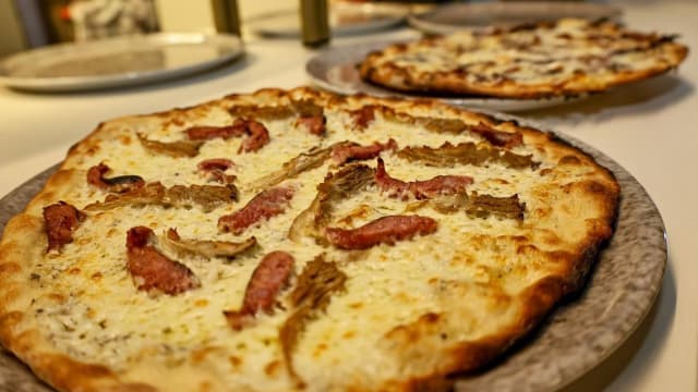 - Setas, orecchia, champiñones, mozzarella, fior di latte, bechamel, salsa de trufa, grana padano