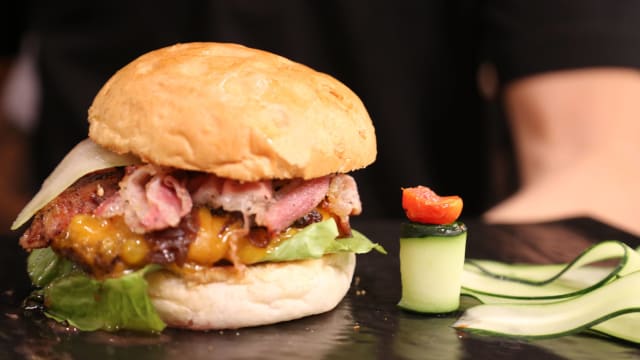Pane,180 gr di manzo, bacon, cheddar, lattuga e cipolla caramellata