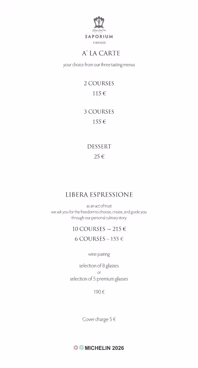 9/10Visiting on our vacation trip and found the restaurant in the guide Michelin. Good restaurant with thoughtful young bright chef comes out to greet you. Meat pre fix consisted mostly of game: hare, rabbit, snails. Kind of wished for a bit of a beef or something bloody :). Each dish is flavorful and pleasantly presented. The beef would have polished it into the outstanding menu and would have justified the price, as well as give us that bit of Florence we were looking for. Restaurant ambience is very good. Not loud or annoying or stuffy in any way. Waiters and staff were courteous and friendly. Recommend!