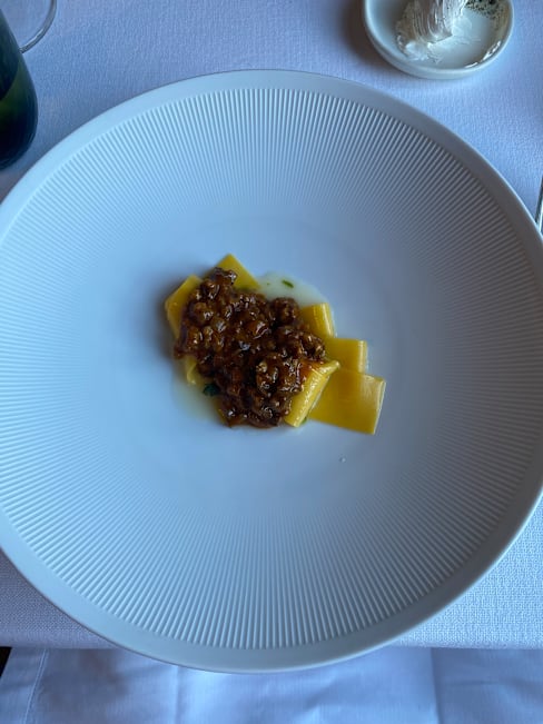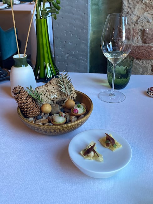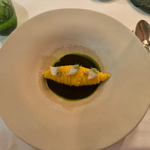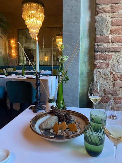 9.5/10The restaurant is by the river, the blue atmosphere has a feeling of entering a forest, the food is creative and tasty, well deserved one Michelin star and Condé Nast Traveller list, I will be back here and the overall service was excellent. It's worth mentioning though that the sommelier was very unfriendly, not pronouncing the word correctly when I tried to enquire what Franciacorta I could recommend, after all the word isn't in English either, and then he acts like he's educating unseasoned rednecks to tell you that proseco isn't champagne! Of course, being a food and wine lover knows the difference between them, and being in rather than France, I enquired at the back of the order if this Franciacorta was dry? He indifferently said that all Franciacorta are dry, and when nearing the end of the dessert, quickly collected the glasses and had no dessert wine pairing suggestions, very unprofessional and impolite.