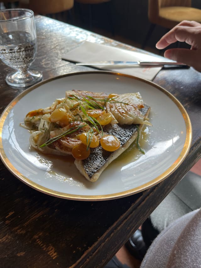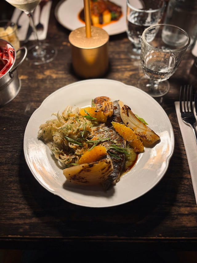 Filet de daurade cuit à l’unilatéral, quartiers de fenouils confits, salade de copeaux et coulis à l’aneth, jus d’orange caramélisé.