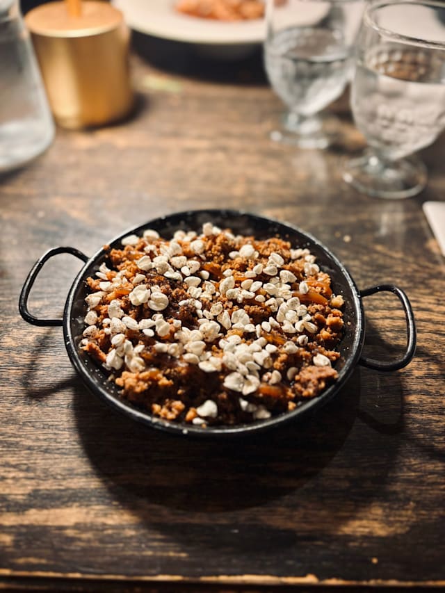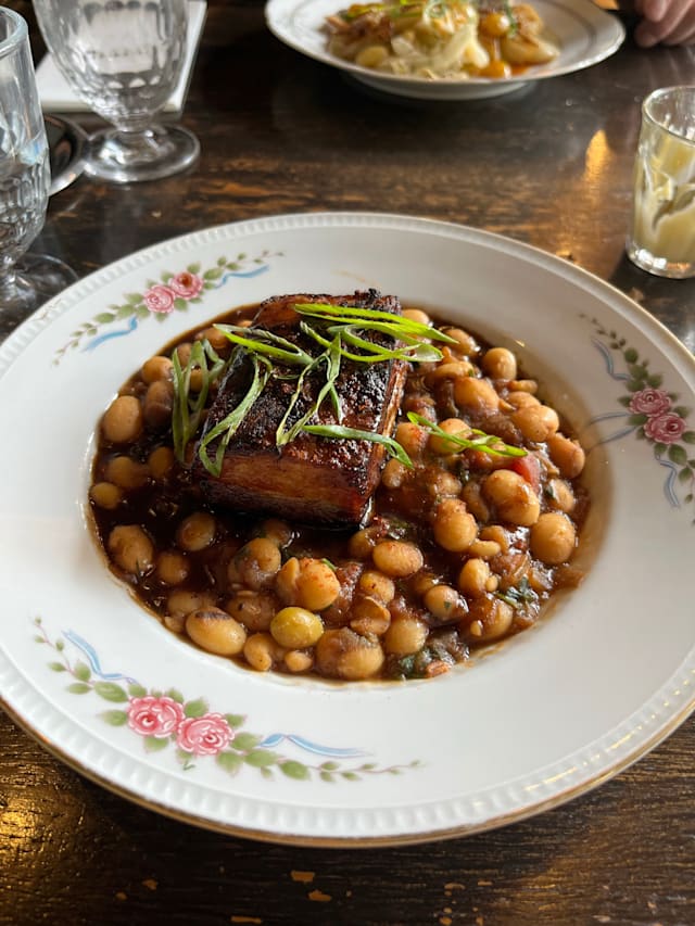 Poitrine de cochon confite puis snackée, haricots Coco de Paimpol cuisinés au jus de viande, julienne de chorizo croustillants.