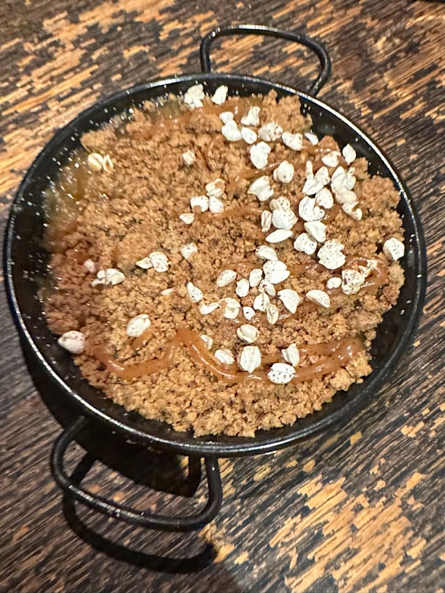 Crème de mascarpone à l'amaretto, biscuit cuillère maison, crémeux chocolat au lait et café serré, praliné feuillantine