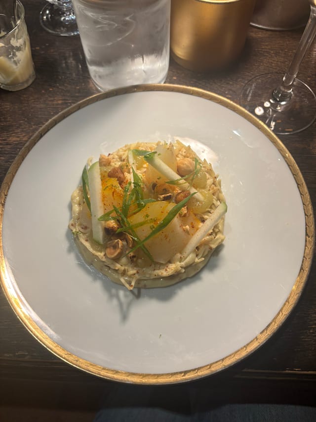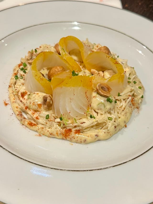 Julienne de céleri rave moutardée, fines tranches de haddock fumé à l’ancienne, bâtonnets de pommes Granny Smith et noisettes torréfiées.