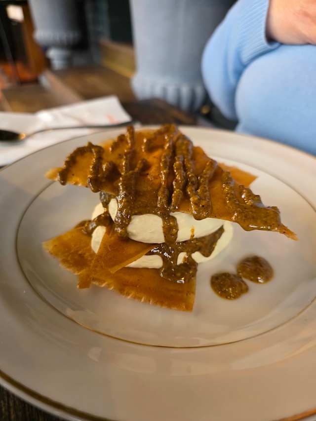 Feuilles de brick croustillantes, crème diplomate à l’eau de fleur d’oranger, praliné à la pistache, éclats de pistaches croquantes.